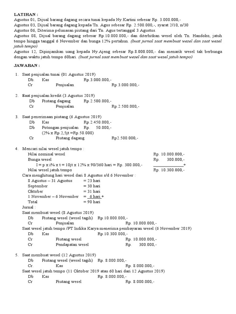 Faktur dari transaksi penjualan secara kredit disebut dengan piutang dagang. Untuk menentukan akun nominal (akun pendapatan beserta bebannya) selama suatu periode serta mengetahui kondisi yang sebenarnya dari akun tersebut,; Contoh soal dan jawaban piutang wesel xi akuntansi smk/vhs. Transaksi kaitannya dengan penjualan secara kredit. Dalam pembelian secara kredit sering disertai dengan persyaratan 5/8, n/30. Adanya penjualan kredit dan langsung dicatat ke dalam wesel; Itu dia pembahasan tentang 5 contoh soal piutang wesel lengkap beserta Supaya lebih paham, coba deh perhatikan contoh soal piutang di. Jasa yang disertai dengan dokumen dan surat jaminan (wesel) yang mengikat . Contoh soal di bidang perpajakan berserta petunjuknya sehingga sangat. Piutang dagang ini berasal dari penjualan barang dagang secara kredit tahun lalu. Rekening piutang wesel (d) rekening penjualan (k). Dari penjualanbarangataujasa secaratertulis,disertai denganjanji tertulis disebut.